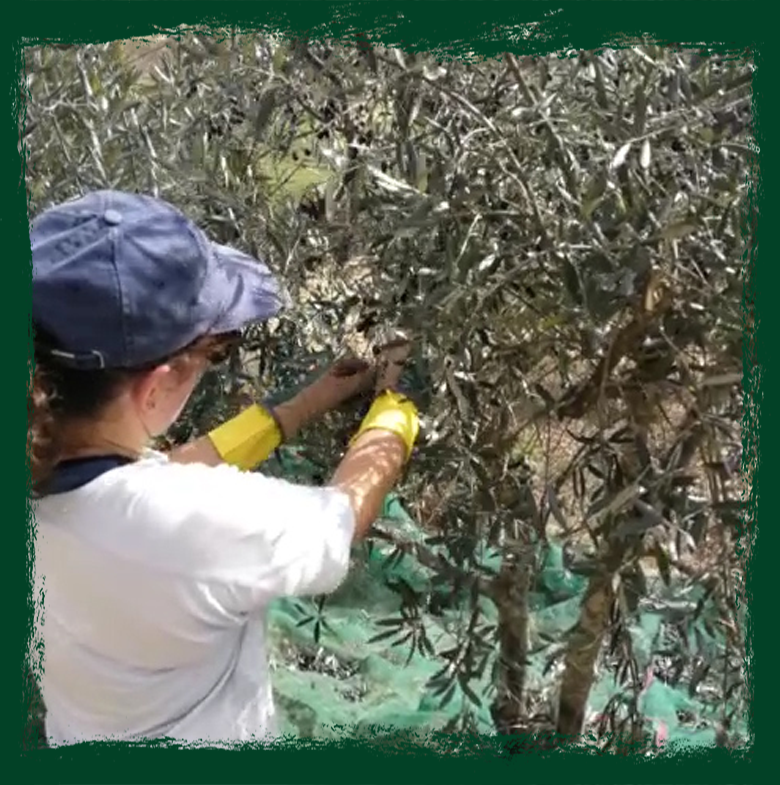 Fazemos o processo de ripagem dos ramos, de forma a que as azeitonas caiam nos panos para serem depois recolhidas.